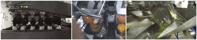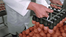 同样是负压吸取鸡蛋,机器接了气泵控制。快速分离,分离过程整合成三层,Di一层打开鸡蛋,第二层震动蛋液,然后蛋黄留在第二层,蛋液流到第三层。三层流水线朝不同的地方倒,就完成分离了。这样得到的生蛋液,都要经过巴氏灭菌——用60~90°C的短暂加热。这样既能杀死微生物又不损害品质。