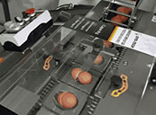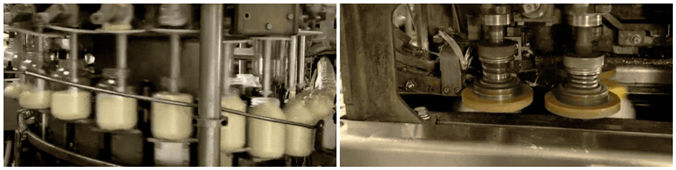 灌装生产线中,转盘式灌装机工位之中底下的流水线走塑料罐,上面灌蛋黄酱,0.25秒就能装满一个600毫升的大罐子,再看这么多的灌装喷头,产出速度非常惊人。灌装工位完成后,进入旋盖工位,采用