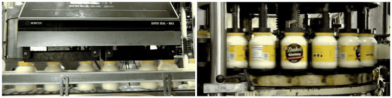 电磁感应铝箔封口机,是用感应加热的方式密封的。给罐子拧上盖子后,有感应机器只在罐口部位加热一下下,就把封口膜粘住密封了,局部的感应加热好处是不会烫到内部的蛋黄酱,毕竟酱料是很容易变质的。