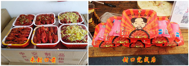 盱眙周小帅龙虾食品有限公司的生产车间,盒装龙虾封口机正在对烧制好的速冻龙虾进行包装